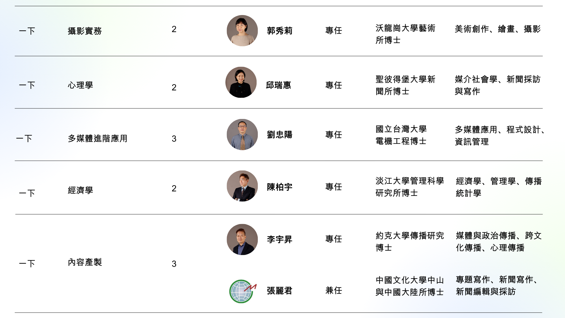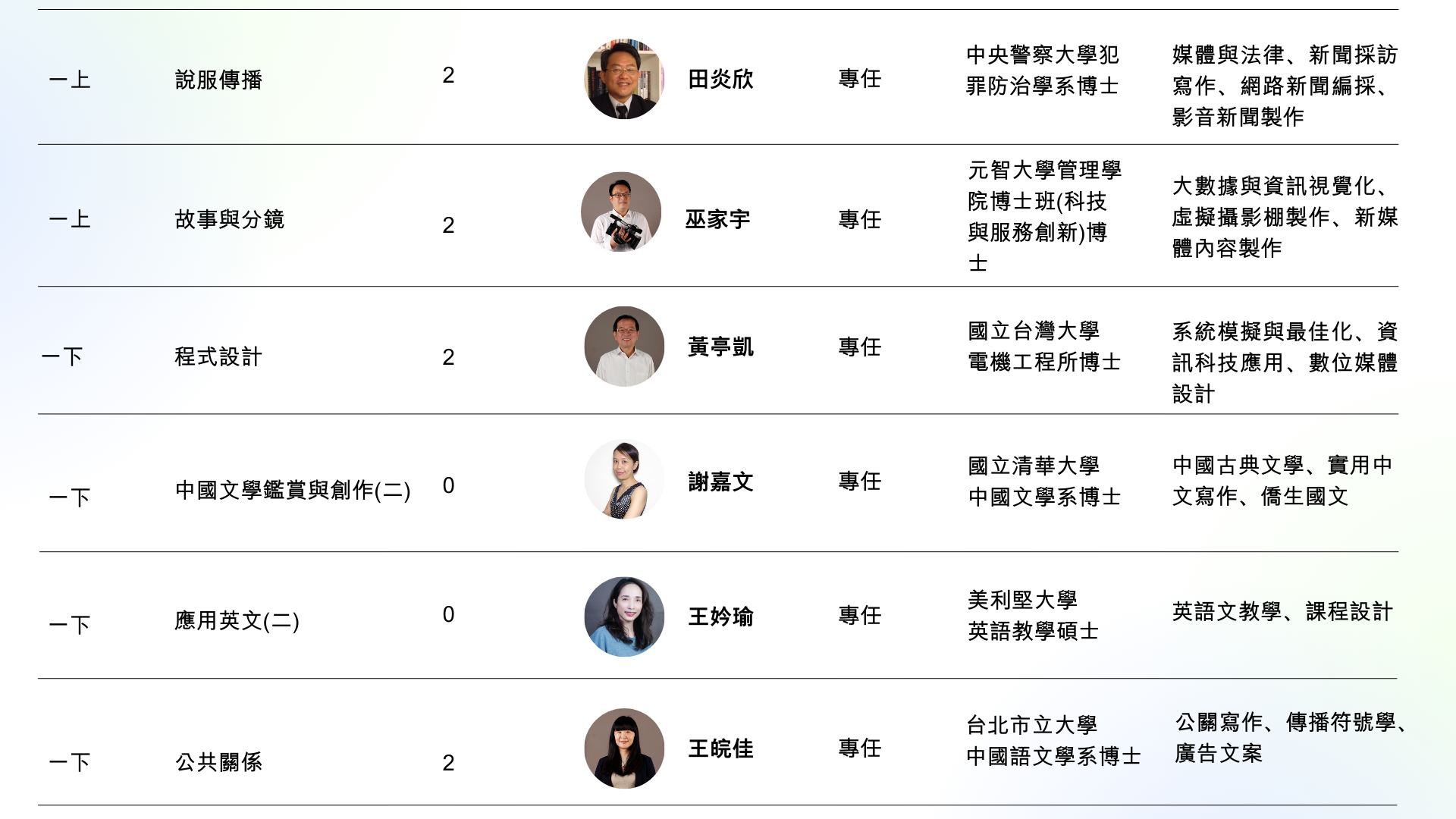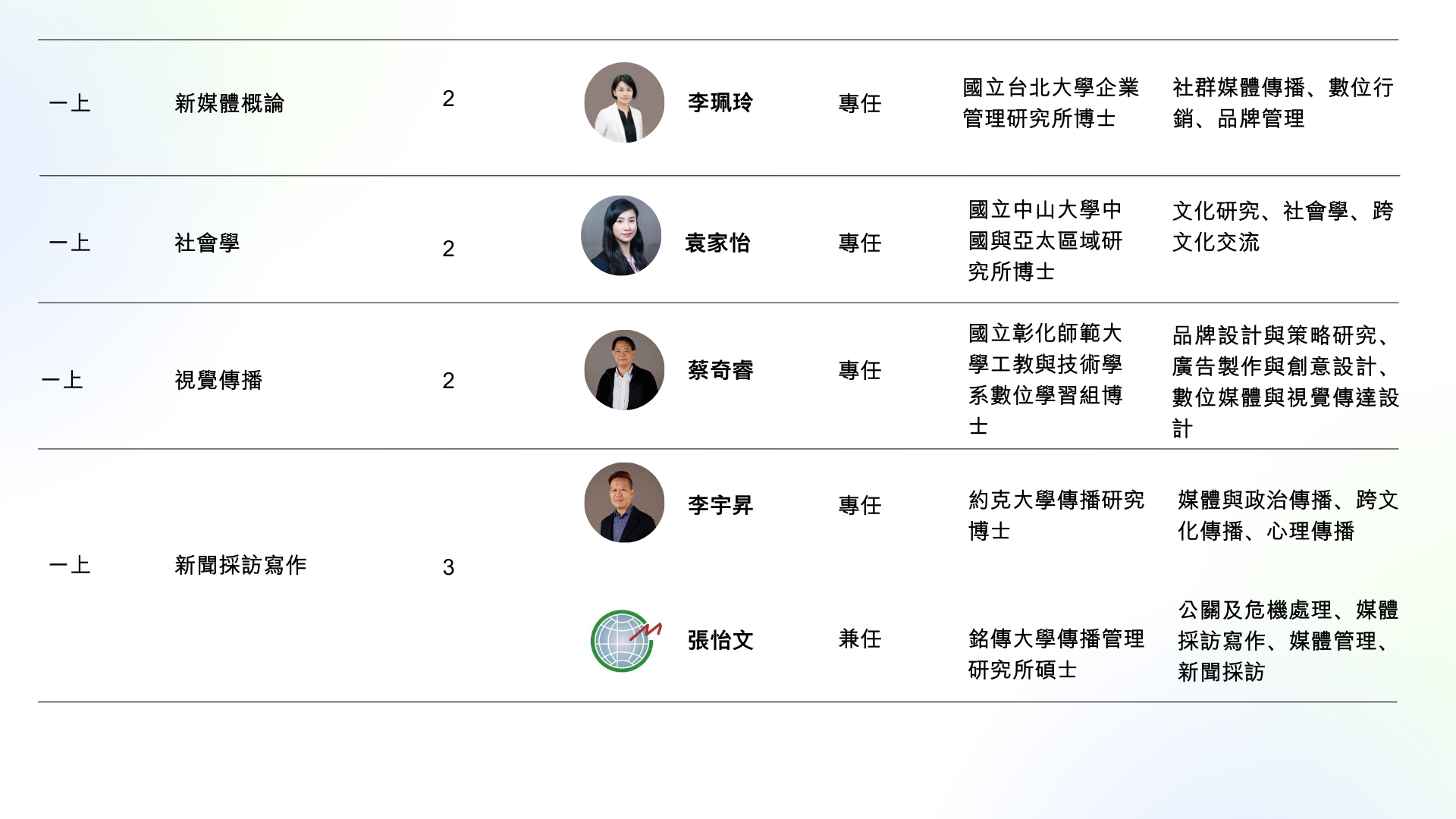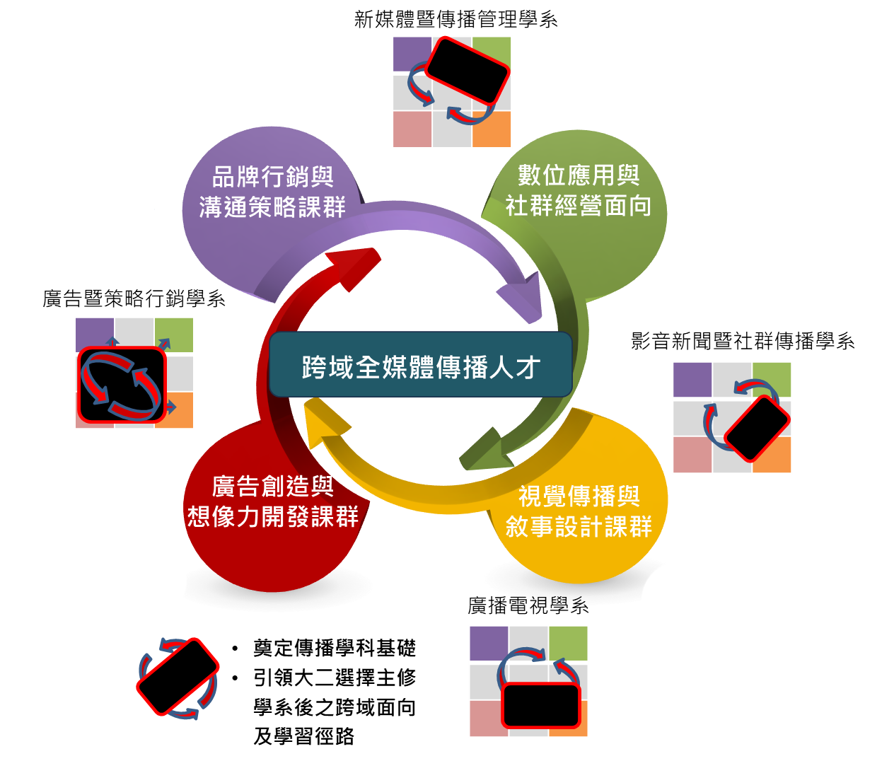 課程規劃▸課程設計理念因應傳播產業的轉型與發展趨勢,培養兼具新溝通、人文素養與科技新知之跨域全媒體傳播人才。「全媒體大一不分系」課程規劃除了奠定學生廣泛的學科基礎外,並進而促進學生理解傳播產業各個不同面向的相互關聯性(請參見圖1)。並針對各課程面向及其所對應課程進行設計,進而引領學生在大二分流選擇主修學系後之跨域學習路徑(請參見圖2)。 圖1 課程設計面向及相互關聯性 圖2 課程設計面向及對應全媒體大一不分系課程▸詳細課程規劃